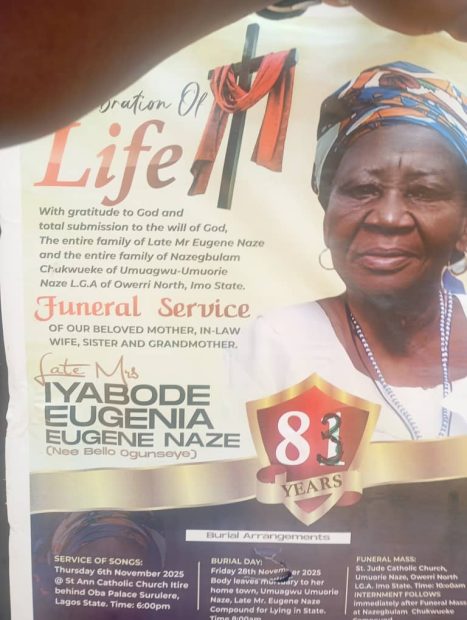 It was a day meant for mourning and the repose of late Mrs. Iyabode Eugenia Eugene Naze (nee Bello Ogunseye), the mother of Mr. Chukwuemeka Bamidele Nazi, popularly called “Uncle Dele” by his schoolmates, friends, lovers and followers alike, and the event truly lived up to its billing going by the calibre of representations of groups that spanned virtually all the six geo-political zones of Nigeria, including the diaspora.